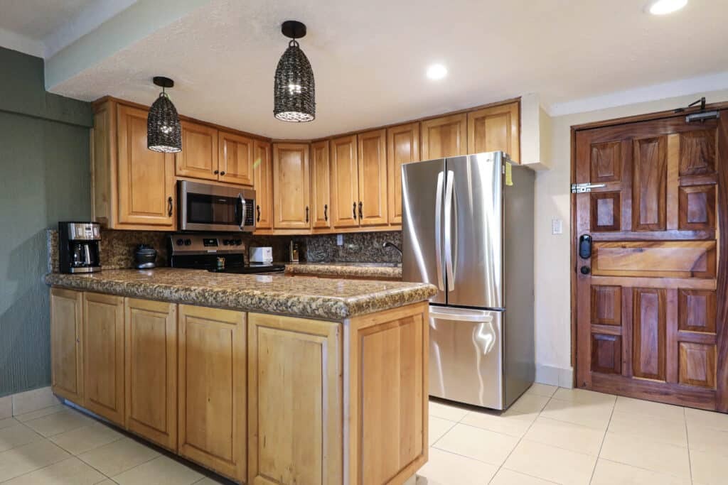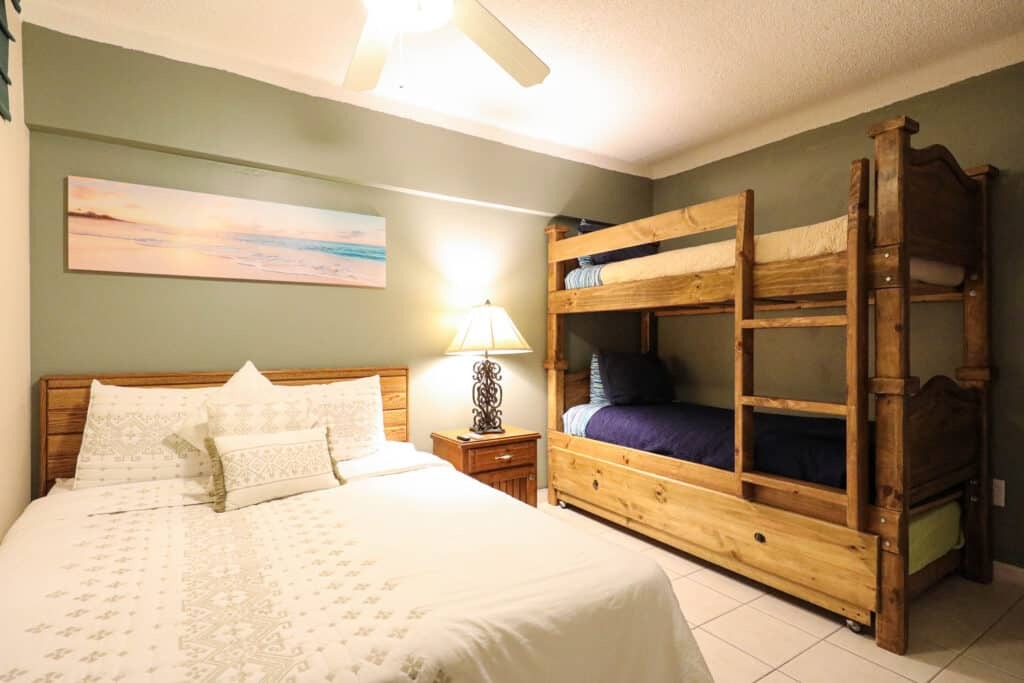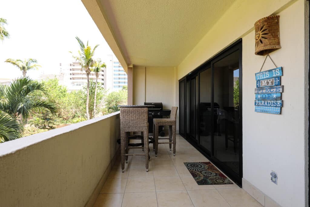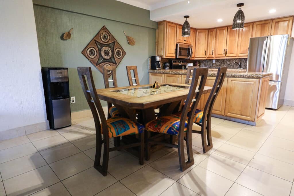 Located in the heart of Cabo San Lucas, one block from the famous Medano beach, a 5-minute walk to the center of Cabo and the Marina is this beautiful condo which can sleep up to six guests with a King bed in the master bedroom and a Queen and Bunkbeds in the second bedroom, there are two full bathrooms with all the amenities plus hair dryers. The Kitchen has everything to satisfy all your cooking needs. Also, there is filtered water in both bathrooms. For your convenience there is also a 5-gallon purified water dispenser for hot and cold water in the dining area. Eat at the large dining table that seats 6 or BBQ your catch of the day on the spacious Patio while you are enjoying the beautiful view of the courtyard and pool. Quiet air conditioning and ceiling fans in each room keeps you cool during the warm summer nights. For your entertainment a 65” Flat Screen Smart TV in the living room with hundreds of channels to chose from (USA, Canadian and Spanish) and 40” Flat Screen Smart TVs are in both bedrooms. This condo has its own dedicated Fiber Optic Internet service (150 Mbps) plus phone service with free Local & International calling.