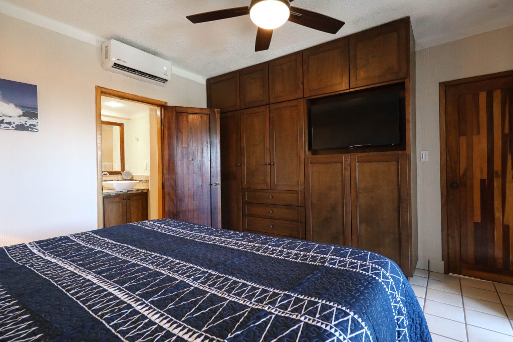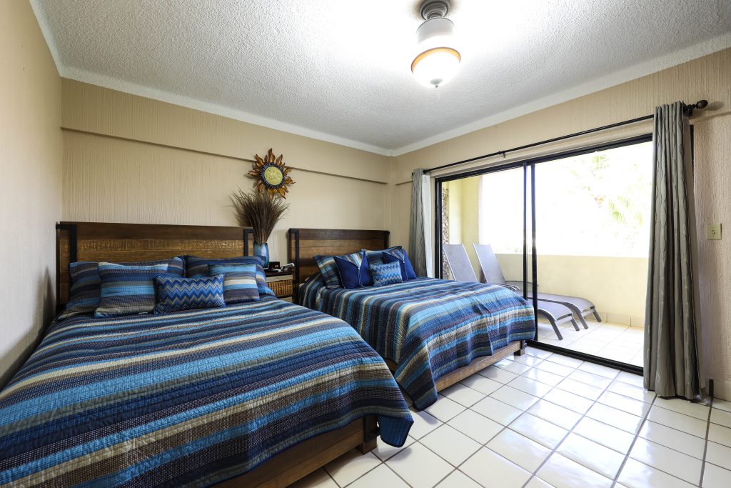 This exquisite unique 2-bedroom condo, located in the heart of Cabo San Lucas, one block from the famous Medano beach, and only a five-minute walk to the center of Cabo and the Marina, can sleep 6 guests, having a King bed in the master bedroom and two Queen beds in the second bedroom. There are two full nicely appointed bathrooms, both with hair dryers. This unique condo has access to the patio from both bedrooms, so when you get up in the morning you can walk straight onto the patio to enjoy your first cup of coffee. A fully fitted kitchen will take care of all your cooking needs, eat at the dining table or Bar-B-Que on the spacious patio which has a beautiful view of the courtyard and pool or dine at the ‘Tres Amigas Cantina’ poolside Restaurant and Bar, where they serve Breakfast, Lunch and Dinner at great prices. Quiet mini split A/C's and ceiling fans in all rooms keeps you cool during the warm summer evenings. For your entertainment pleasure, there is a Large Flat Screen TV in the living room with many channels to choose from and Flat Screen TV,’s in both bedrooms. To keep you in touch with the rest of the world this condo has its own dedicated Fiber Optic Internet service (300 Mbps) plus phone service with free Local & International calling.