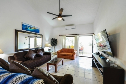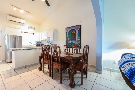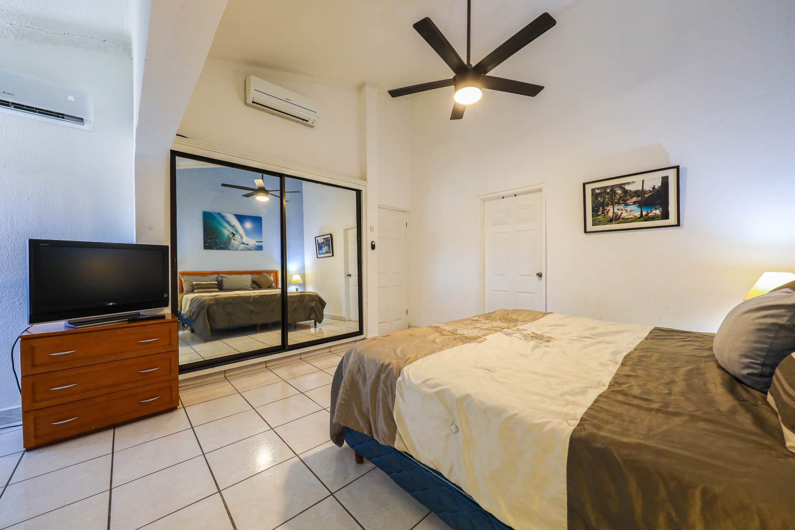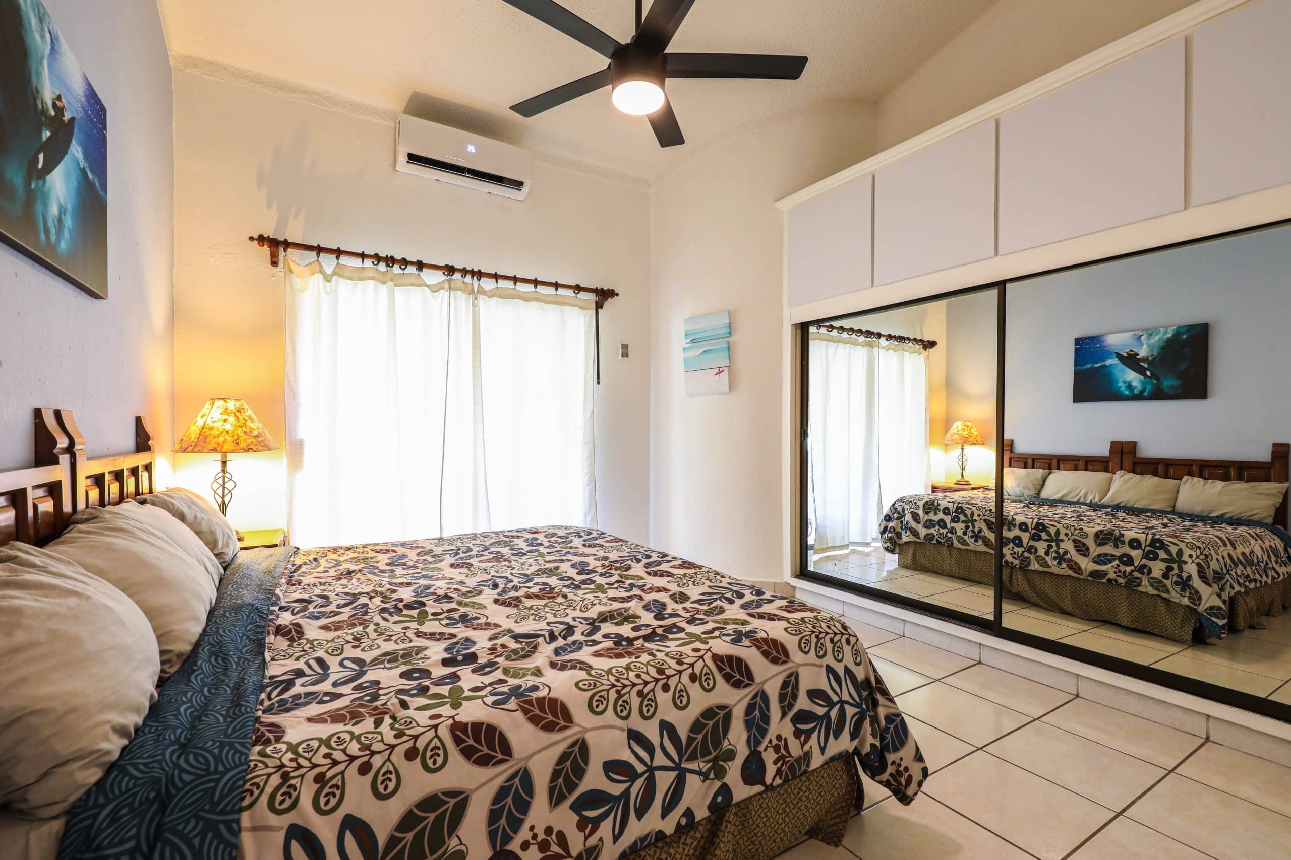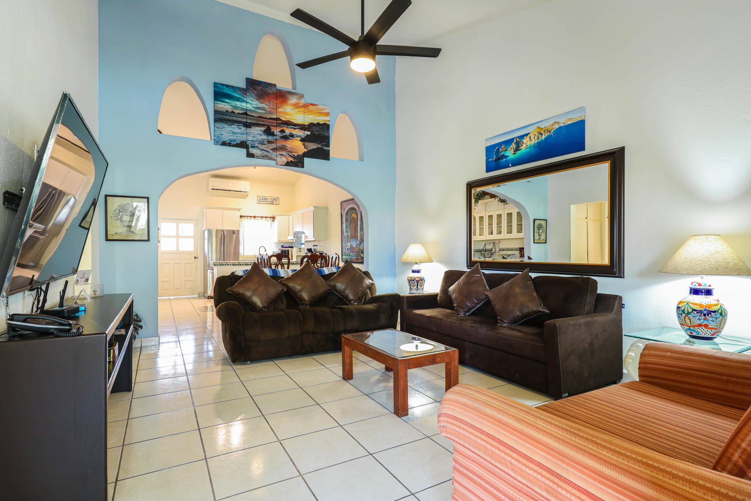 This beautiful remodeled 2-bedroom Penthouse condo with Vaulted ceilings, located in the heart of Cabo San Lucas, one block from the famous Medano beach, and only a five-minute walk to the center of Cabo and the Marina can sleep 6 guests, having 2 bedrooms (a King in the master bedroom, a King in the second bedroom and 2 Queen size Sofa beds in the living room. There are 2 well-appointed full bathrooms. The kitchen is equipped to meet all your cooking needs. A large dining table seats 6. Bar-B-Que on the patio which has a beautiful view of the courtyard and pool or dine at the ‘Tres Amigas Cantina’ poolside Restaurant and Bar, where they serve Breakfast, Lunch and Dinner at great prices. Quiet mini split A/C's and ceiling fans in all rooms keep you cool during the warm summer evenings. For your entertainment pleasure, there is a Large 65” Flat Screen TV in the living room with 100’s of channels to choose from. To keep you in touch with the rest of the world this condo has its own dedicated Fiber Optic Internet service (60 Mbps) plus phone service with free Local & International calling.