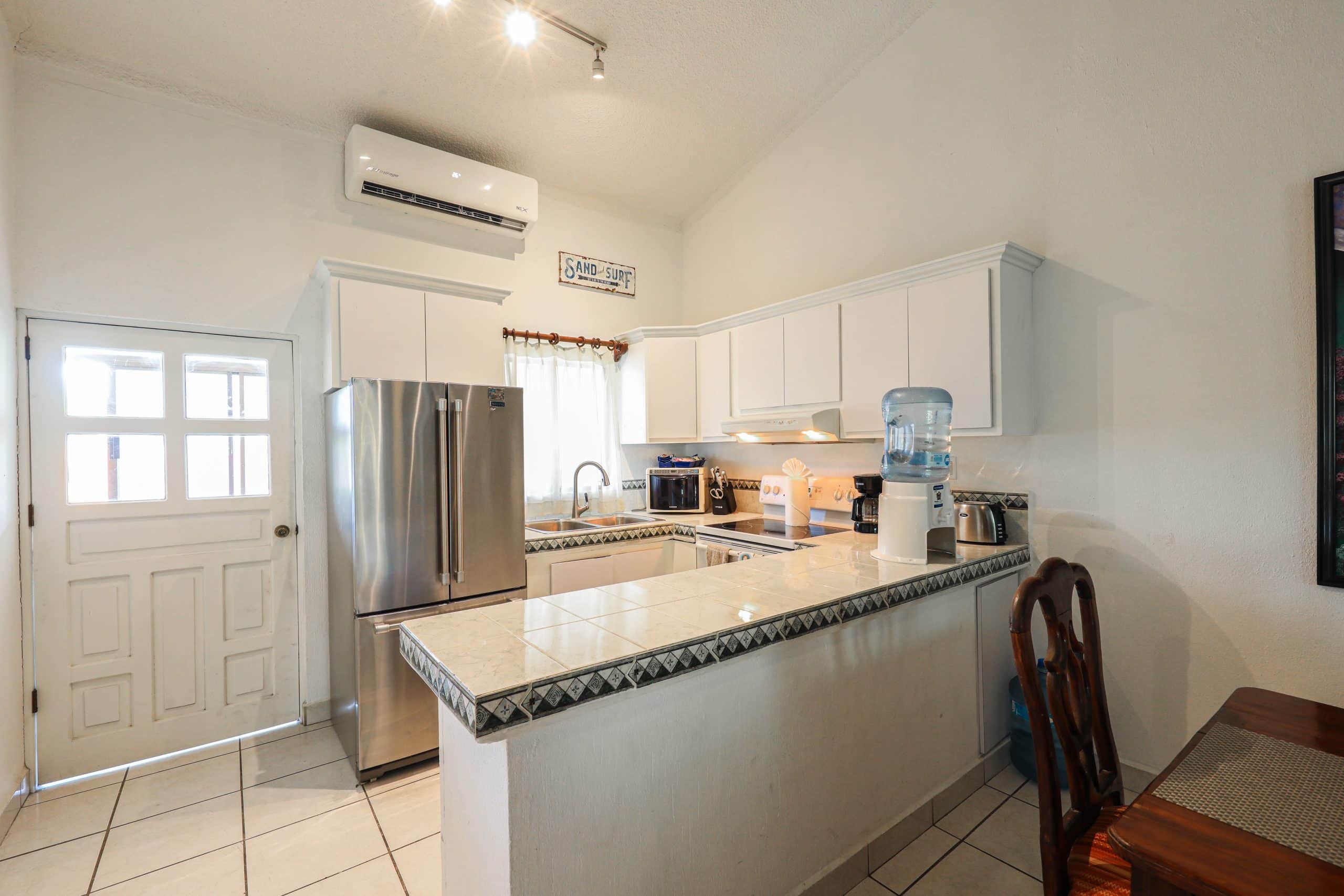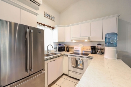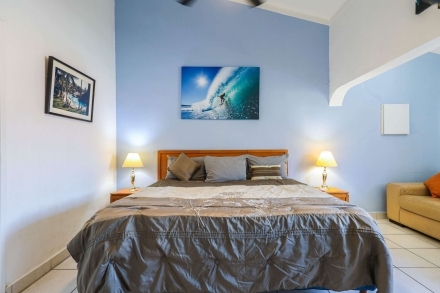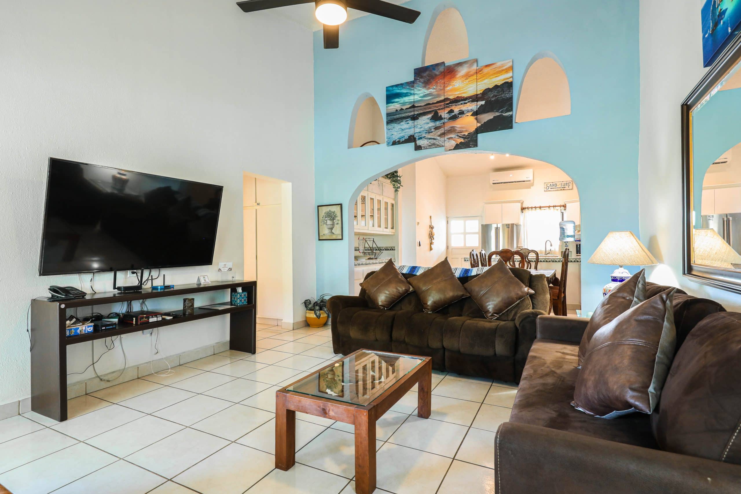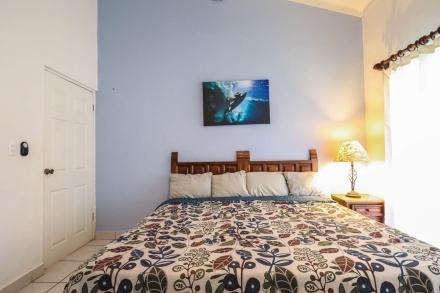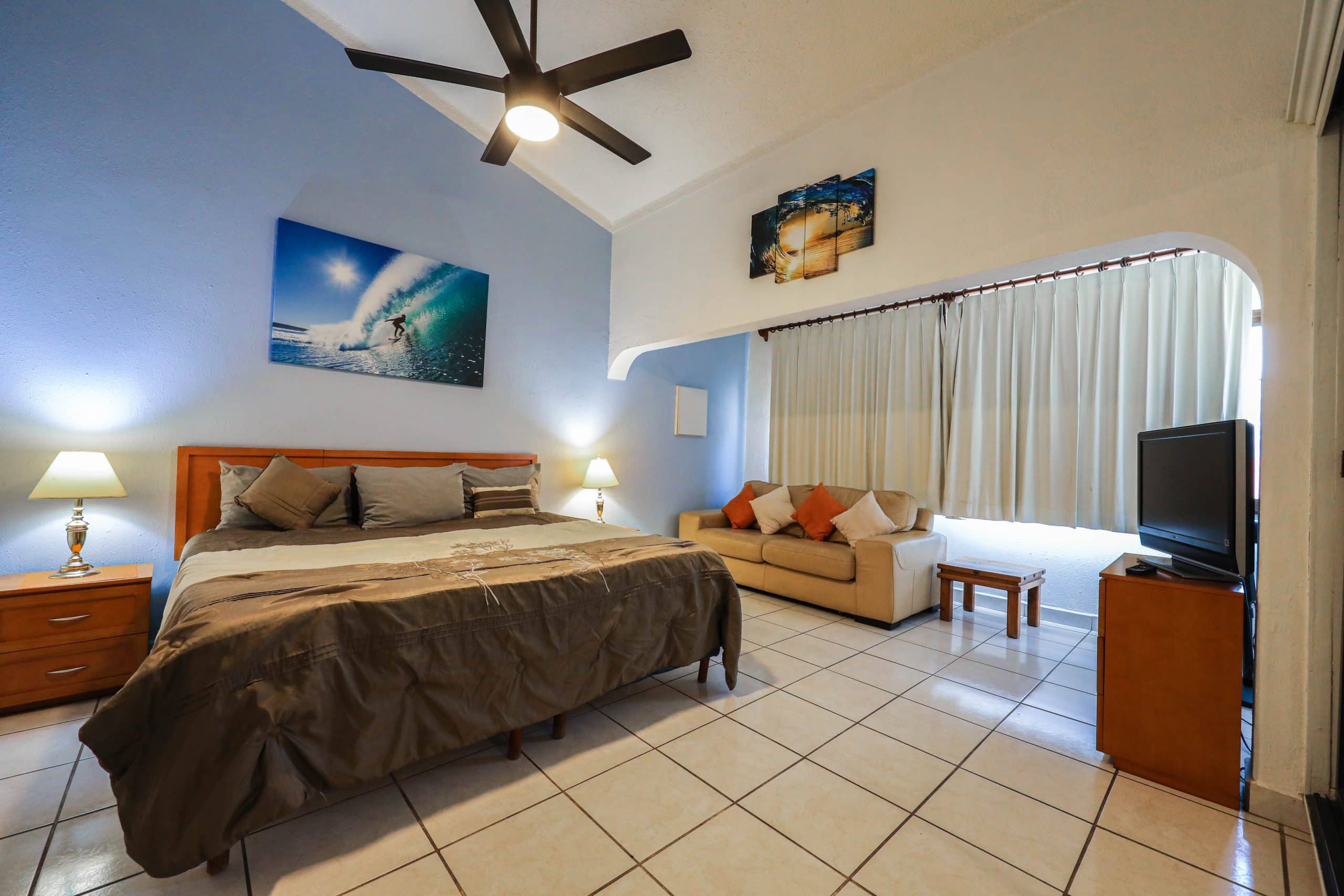 This beautiful remodeled 2-bedroom Penthouse condo with Vaulted ceilings, located in the heart of Cabo San Lucas, one block from the famous Medano beach, and only a five-minute walk to the center of Cabo and the Marina can sleep 6 guests, having 2 bedrooms (a King in the master bedroom, a King in the second bedroom and 2 Queen size Sofa beds in the living room. There are 2 well-appointed full bathrooms. The kitchen is equipped to meet all your cooking needs. A large dining table seats 6. Bar-B-Que on the patio which has a beautiful view of the courtyard and pool or dine at the ‘Tres Amigas Cantina’ poolside Restaurant and Bar, where they serve Breakfast, Lunch and Dinner at great prices. Quiet mini split A/C's and ceiling fans in all rooms keep you cool during the warm summer evenings. For your entertainment pleasure, there is a Large 65” Flat Screen TV in the living room with 100’s of channels to choose from. To keep you in touch with the rest of the world this condo has its own dedicated Fiber Optic Internet service (60 Mbps) plus phone service with free Local & International calling.