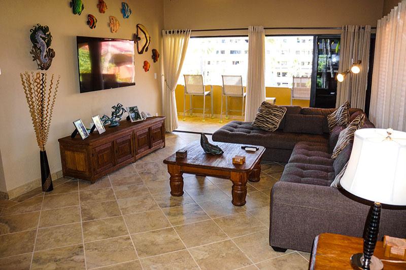 This beautiful remodeled 3-bedroom 1737 square foot Penthouse condo with Vaulted ceilings, located in the heart of Cabo San Lucas, one block from the famous Medano beach, and only a five-minute walk to the center of Cabo and the Marina can sleep 6 guests, having 3 bedrooms (a King in the master bedroom, a Queen in the second bedroom and 2 Twins in the third bedroom), there are 2 well-appointed full bathrooms. The kitchen has granite counter tops and is equipped to meet all your cooking needs. A large dining table seats 6. Bar-B-Que on the large wrap around patio which has a beautiful view of the courtyard and pool or dine at the ‘Tres Amigas Cantina’ poolside Restaurant and Bar, where they serve Breakfast, Lunch and Dinner at great prices. Quiet mini split A/C's and ceiling fans in all rooms keeps you cool during the warm summer evenings. For your entertainment pleasure, there is a Large Flat Screen TV in the living room and Flat Screen TV's in both bedrooms, Netflix is available on all 3 TV's. To keep you in touch with the rest of the world this condo has its own dedicated Fiber Optic Internet service (60 Mbps) plus phone service with free Local & International calling.