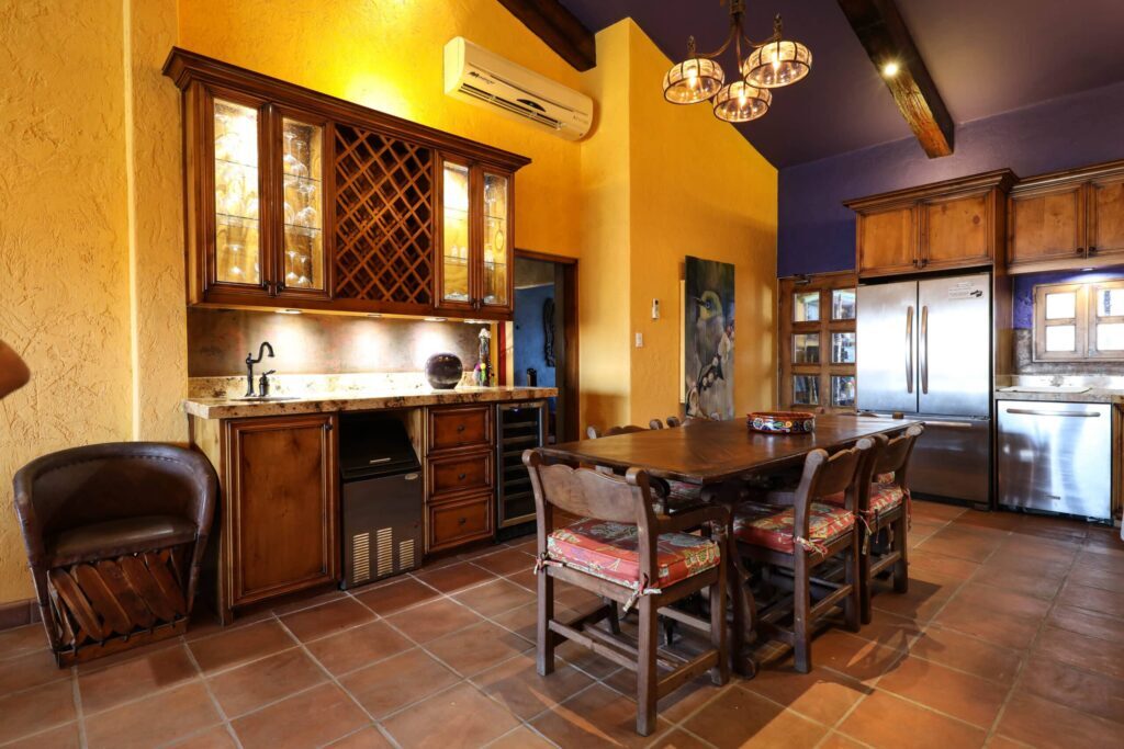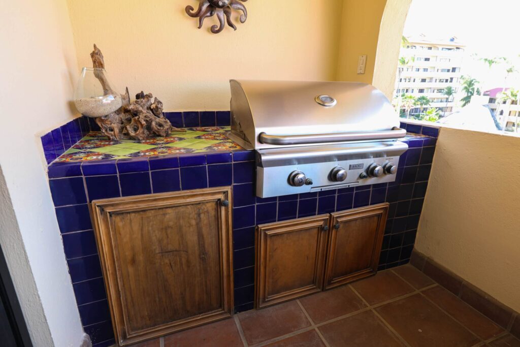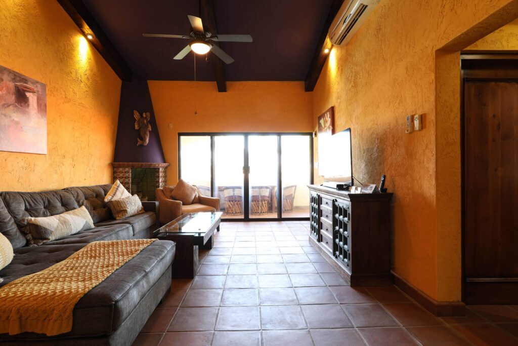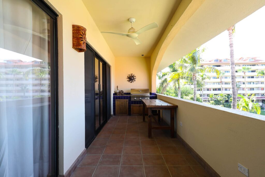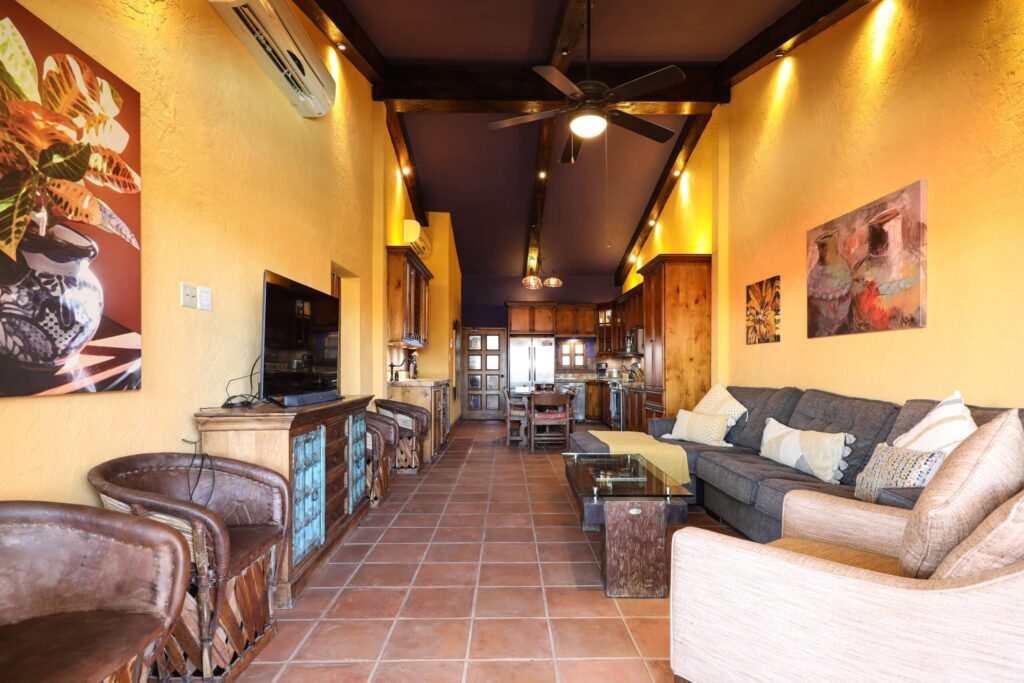 Located on top floor of the "E" Building you will find this walk up 2 bedroom 2 bath unit featuring a colorful Hacienda decor that lets you know you've arrived at the perfect place to relax and unwind in always sunny Cabo! The residence has an open kitchen with all new appliances and is equipped with all the essentials in case you like to cook in. A water filtration system supplies the unit and there is an additional ice maker to cover any desire for blended drinks or a cooler fill up to take fishing. There are flat screen TVs in the main living room, both bedrooms and complimentary in unit Wi-Fi. Retracting glass sliders open onto the front balcony and welcome the outside in. A built in BBQ and outdoor seating make this the perfect spot to grill and enjoy the fish you caught, have morning coffee or enjoying the twinkling lights of the city off in the distance while enjoying an evening night cap. Off the kitchen is a laundry room with full size washer and dryer should you need it or relax and simply drop your laundry off to be done. Your options are endless here. .